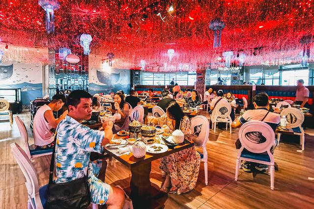 海洋元素的桌椅,水母飘逸的灯饰,上空五彩变幻的霓虹灯...每一个角度里都弥漫着浓郁的浪漫唯美的气息。