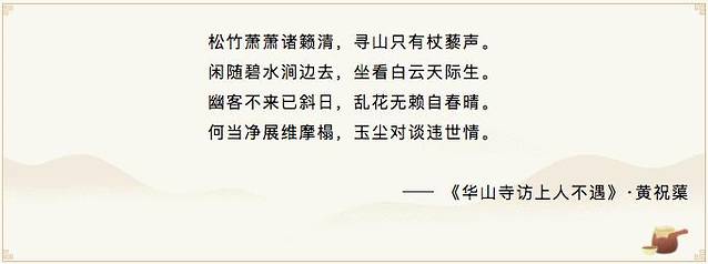 这是一首与芦苞胥江祖庙华山寺有关的诗, 黄祝蕖本想在华山寺探访友人却没有见到,因此写下了这首脍炙人口的诗作,以表达对友人的思念。黄祝蕖是广东有名的诗人,其一生际遇堪称跌宕起伏。