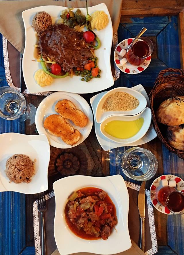 土耳其的最后一餐去到了蓝色清真寺旁一家很有名的景观餐厅Seven Hills Restaurant,餐厅有好几层,楼顶是270度露天景观,之前听说这里的服务员会对 中国 人区别对待,会对欧美人特别热情,不过我们完全没感觉到,上去之后就带领我们去到一个好位置,楼顶风很大,服务员还给我披了毛毯