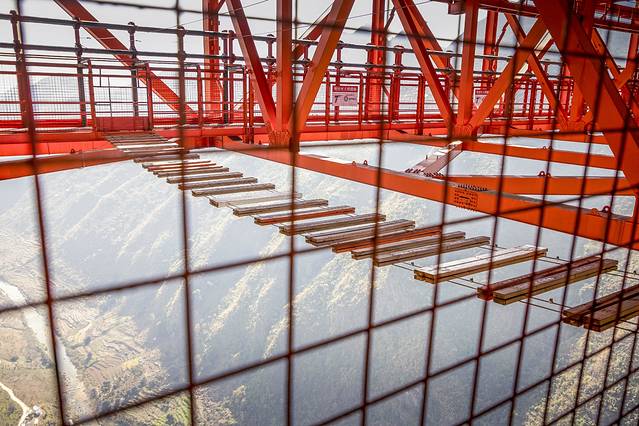这个大桥刚从上电梯到达桥下面的时候,就有点瑶瑶晃晃的恐惧感,还能感受到桥面上飞驰而过汽车带来的颠簸声,越往中间走越吓人,虽然都有到位的安全措施护栏等等,但是你想到你是在桥上,脚底下就是万丈深渊,想想都觉得吓人。