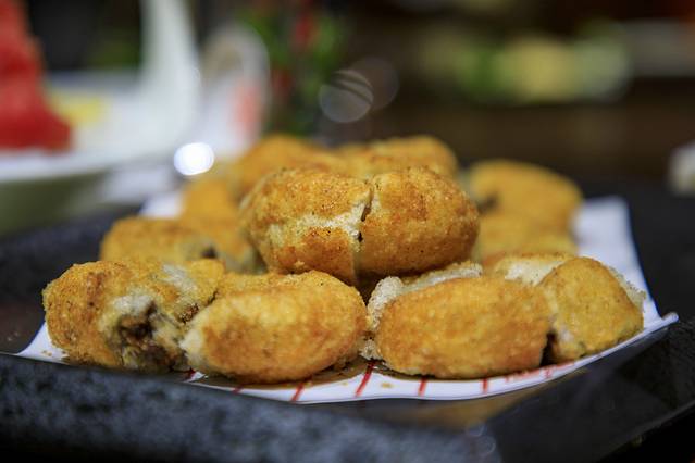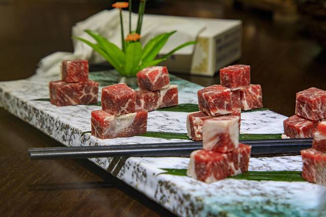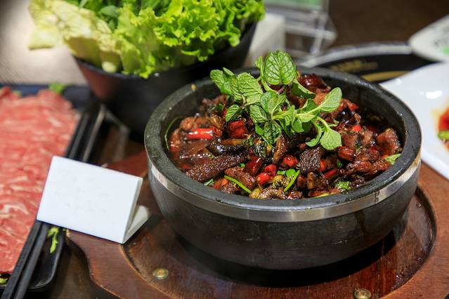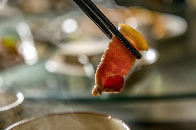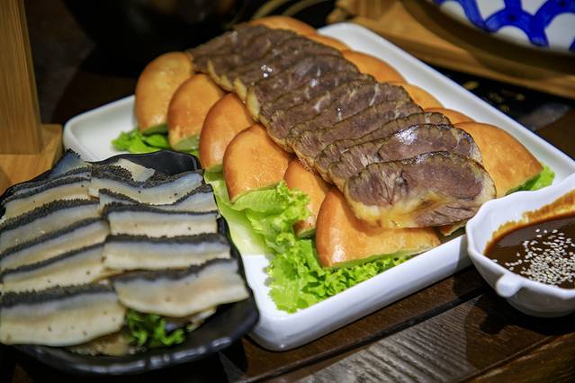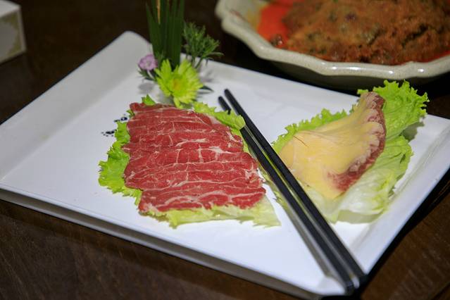 这里的牛肉是可以生吃的,大片的牛肉非常的软嫩,大片的牛油,在火锅里面涮一涮就可以吃了,通常涮牛肉要快狠准,务必速战速决送入口,而胸口朥倒是越煮越香,看似肥油却爽脆不腻口。