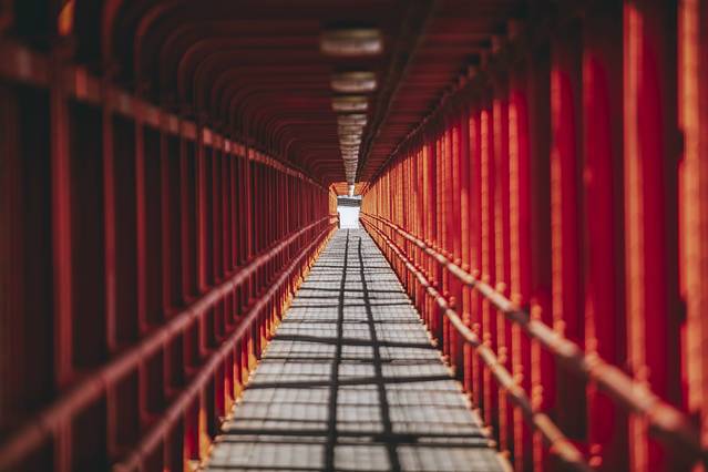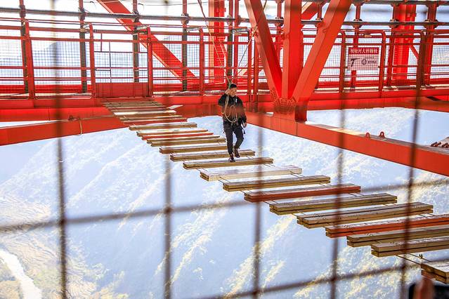 出电梯后大概会走很久,在橙红色钢架结构的长廊上,这是桥面正下方。由于距离太近,可以能清晰地听到桥面上呼啸而过的高速车辆碾压钢架时发出的轰隆声,并不时伴有轻微的震动感。向前走大约500米,就来到位于大桥中央的蹦极台。