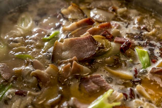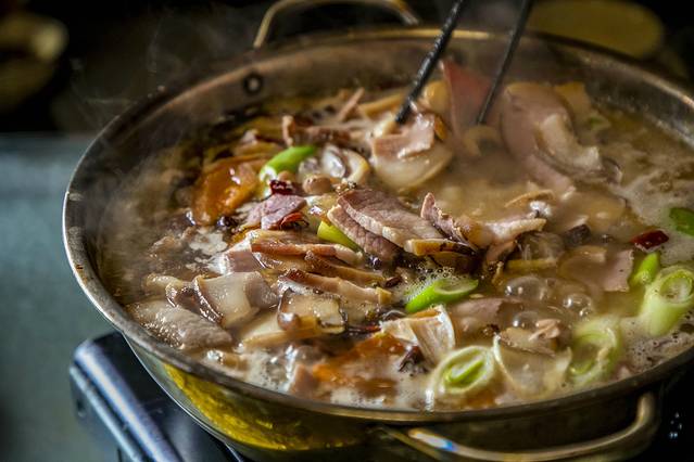 在彝族小镇用餐品尝当地特色的腊肉火锅,在南方的冬天餐桌上就必定会有一道吃不厌的硬菜——腊肉。饭桌上的腊味是充满乡愁的人情味,无论过去还是现在。肥瘦肉层次分明,外表鲜明光润,看着就让人极度有食欲,腊香纯正,酒香浓郁,咸淡适中的独特风味,令人沉醉。