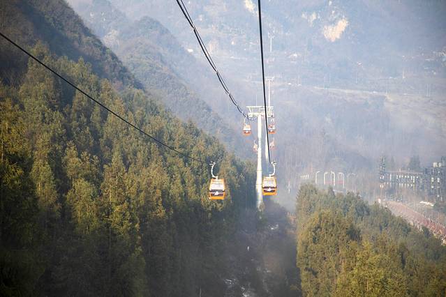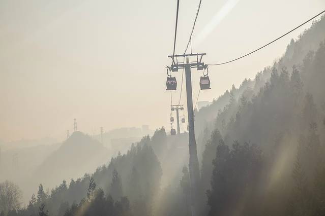 乘坐早上的缆车可以欣赏到漫天的薄雾,太阳慢慢透出重围,出现山峰的那一端,把远处的山峰染成耀眼的金光,日出前的阳光还未能透过层层的山峰,在晨雾的笼罩下变成了如诗如画般的美景。