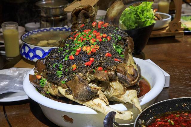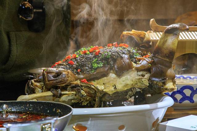 整个的牛头,这种吃法真的是头一次见,超大个的牛头,吃牛头那是需要仪式感的,上牛头,抬盒上菜,锣鼓开道,吆喝四起,刀叉并用一点的一点的从牛头上把肉割下来~