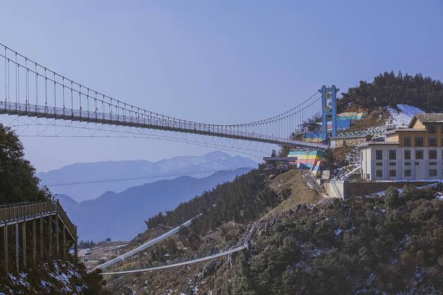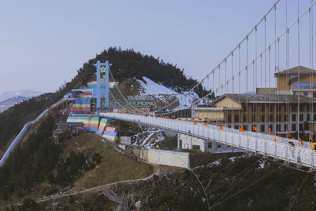 玻璃鹊桥不仅仅是一条单纯的玻璃吊桥,它还将5D碎屏地画效果与桥面完美结合,胆子小的人一定要有心里准备,这并不是真的桥碎了,行走在桥上,既可切身体验玻璃碎裂的惊心动魄感觉,又能欣赏梅花山的无限风光。