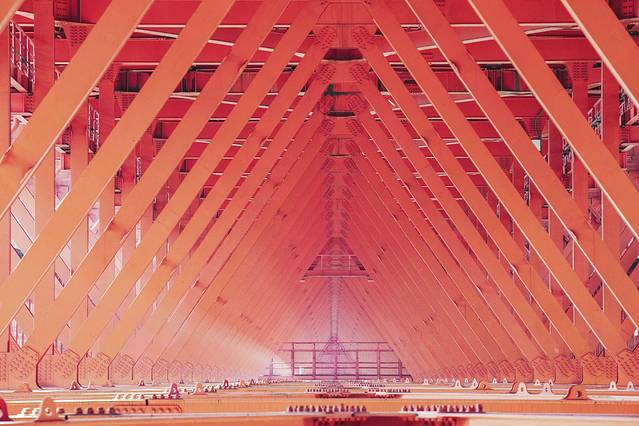 第一次走在大桥的内部,这种很规则的对称美让人从视觉的很舒服,桥梁之美作为一种建筑艺术,其自身的艺术性极大地影响并改变着人类的生活环境。桥梁建筑的结构形式之美,凝聚成灵动的音符或飘逸的画卷,被人们所记忆,是人类宝贵的精神财富。