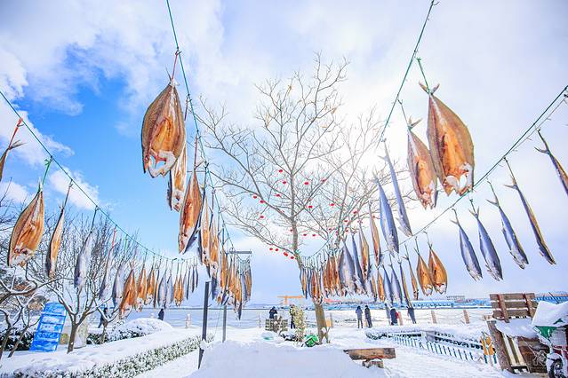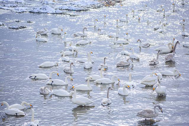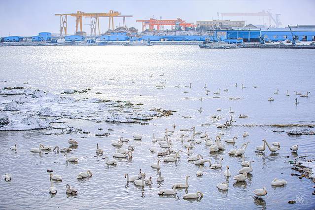 停下车后转了一圈,并没有见到传说中的天鹅湖,难道开错地方了吗?好在随着阵阵的天鹅叫声朝着海的方向走去,来的早不如来得巧,刚好遇到工作人员给天鹅喂食,成百上千从西伯利亚到此过冬的天鹅聚集在眼前,这个画面其实还是非常壮观的,据说原本这里只是一个普通的海湾,因为偶尔迷路的天鹅到此停留歇息,当地好心人给天鹅喂食,一传十十传百,成为更多的天鹅过冬的选择,原来天鹅之间也有做宣传的,实在是很接地气。