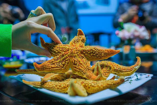相较于之前来威海吃的全“刺身”宴而言,私房菜的菜品质量和摆盘精致了许多,甚至还出现了久违的大海星,这道菜这么多年来对于我而言始终是属于敢看不敢尝的地位,胆子大的小伙伴还是勇敢的尝试了一下,口味吗“据说是很像比较干的蟹黄味道”,至于实际的口感吗,各位有机会还是自己亲自尝试吧,只可意会不可言传。