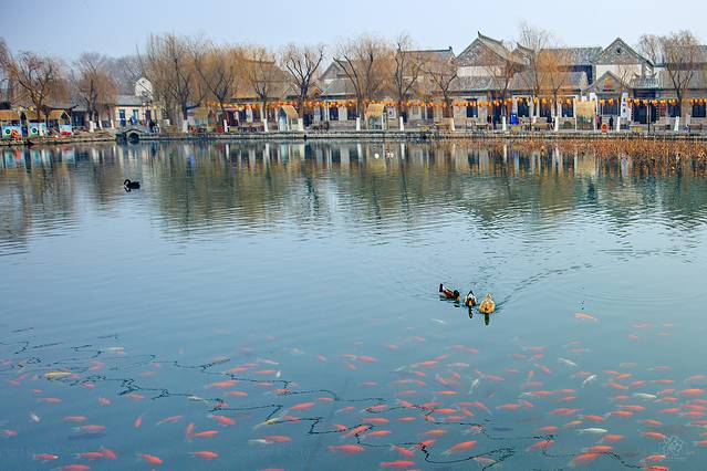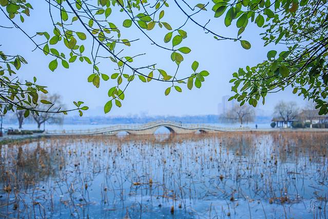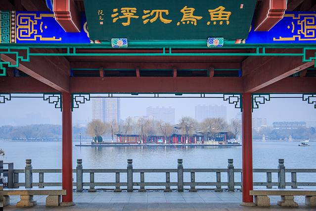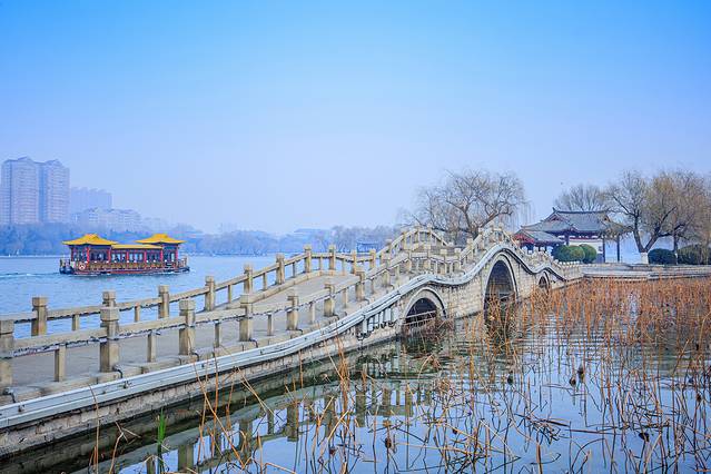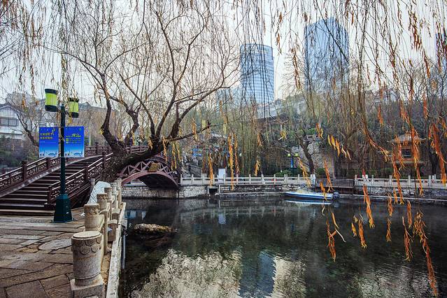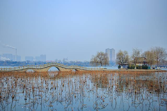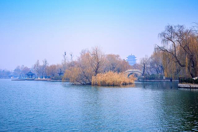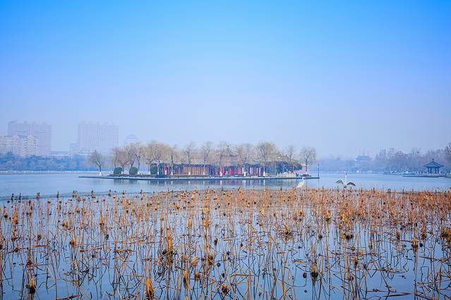 如镜的水,枯柳残荷,加上几座朱梁画栋的楼阁,自成格调。冬日的大明湖虽不见碧波荡漾,但显得格外明净。