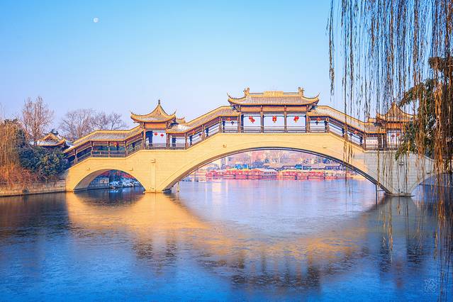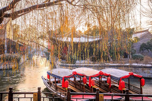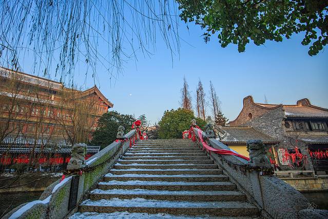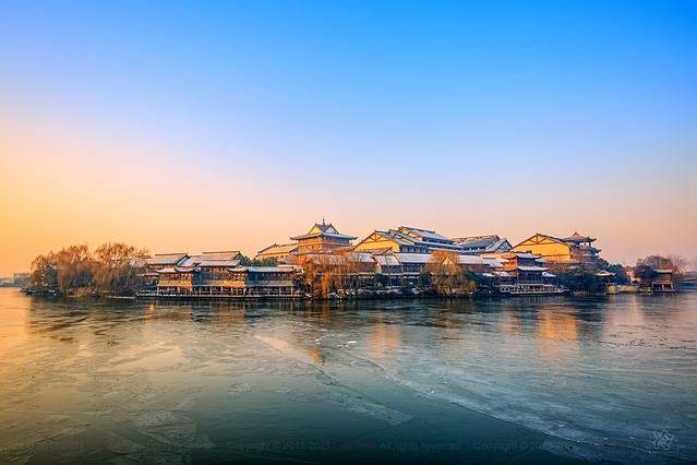 清晨台儿庄呈现出截然不同的风貌,各种网红建筑和打卡点比比皆是,想来要不是冰封雪飘的季节,恐怕很难见到眼前的美景,有种别样的寂静之美。