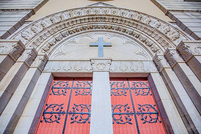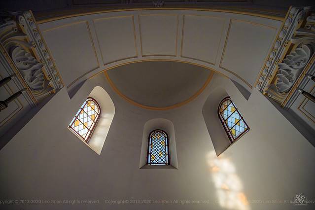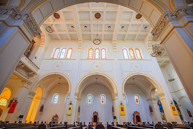 教堂装饰系采用意大利文艺复兴时期形式,可容千人的宽敞明亮的大厅,配以怪诞夸张的巨大肋拱和五光十色的玻璃花窗,每当阳光透过五彩缤纷的花窗照射下来时,给人一种空灵幽邃的神秘感受。