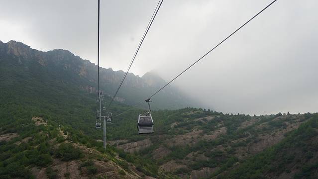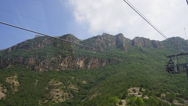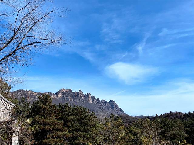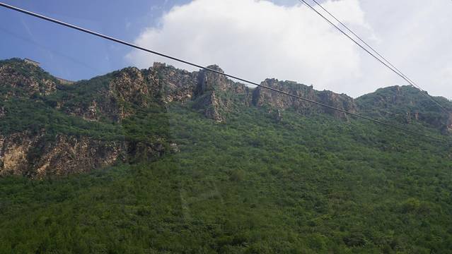 从南到北转到古北水镇尽头,抬头望见苍茫一座山,光秃秃的山石壁立千仞,十分险峻,山顶上蜿蜒的长城依稀可见,如巨龙蟠伏与悬崖峭壁之上,这就是司马台长城!背倚蓝天,横亘东西,傲视天下,让人有一种说不出的震撼。