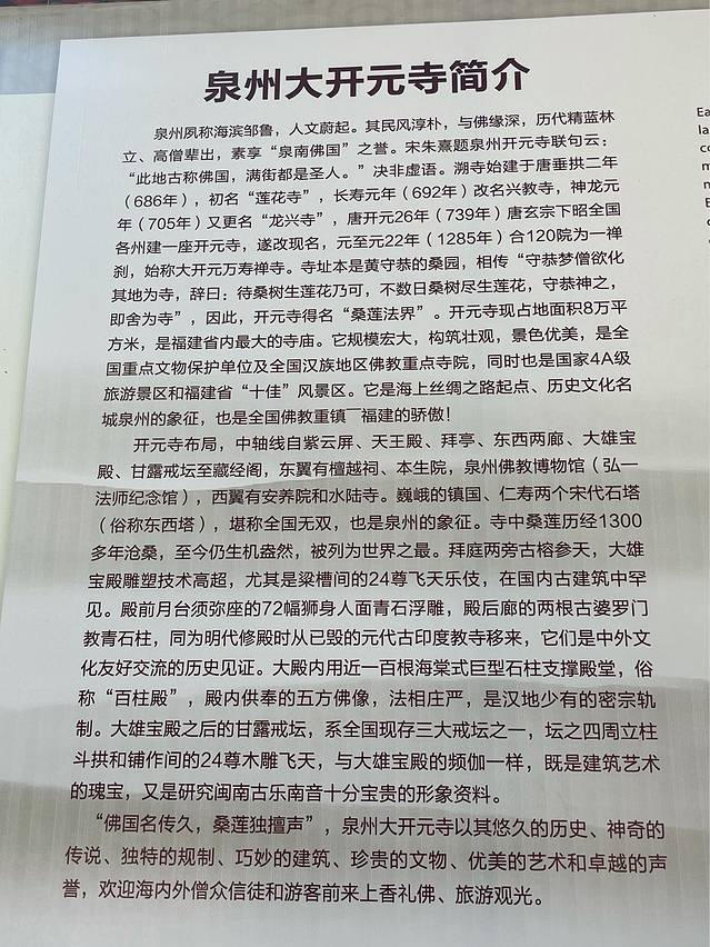 开元寺与洛阳白马寺、杭州灵隐寺、北京广济寺齐名,是我国四大名刹之一。