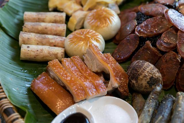 碧绿的芭蕉叶铺在簸箕里,几种不同口味的香肉切了用碗盖好,并整齐的码在在蕉叶上。