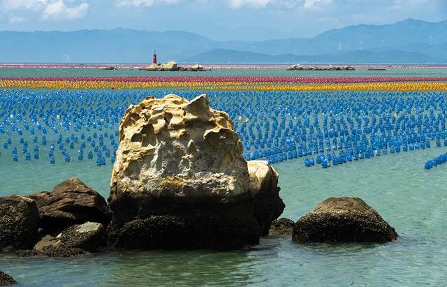 你知道这里的海上为什么漂浮着众多彩色浮球么?这是南澳县为了海域生态养殖所启用的,一方面能够提高牡蛎的产量和质量,另一方面可以有效地保护海洋生态资源。每到金秋时节,便是牡蛎的收获期,如果你此时前来,还能看到渔民的船只在浮球方阵内往返穿梭,呈现出一派热闹而繁忙的海耕美景。