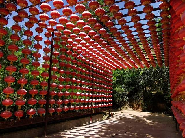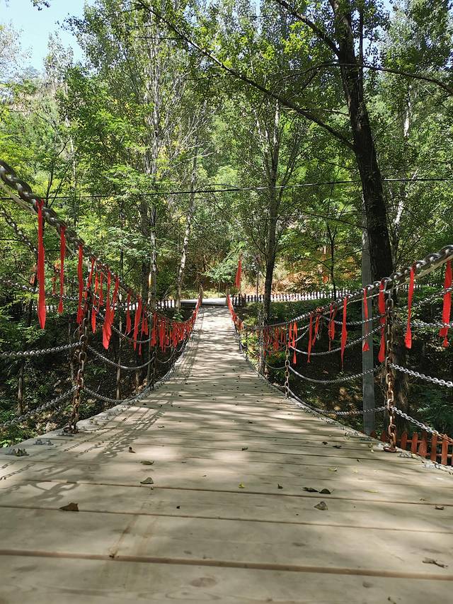 我们一行人悠闲的向景区中心前进,不远处就有一座木质吊桥,看似普通,两侧“破碎”的红色布条让这座吊桥多了一丝古韵,也和不远处的一个布满红灯笼的岔路口遥相呼应,这醒目的红色!