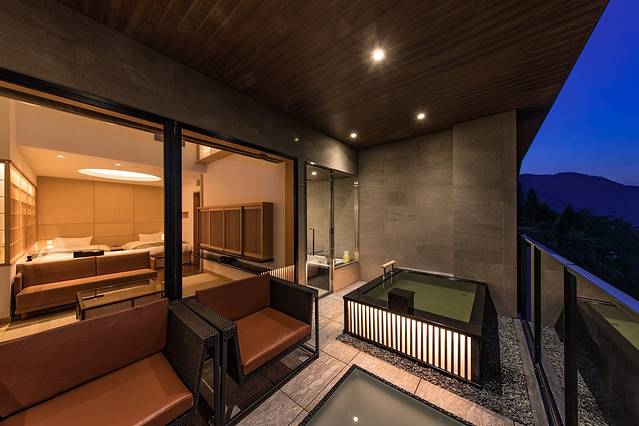 若早晨入浴,可以看见被晨雾笼罩的响溪谷,如同一幅优美朦胧的水墨画。“七折、织姬、南高、莺宿、竜峡”,旅馆里每处设施的名称都是一种梅花的品种,淡雅优美。内部是空间宽敞的和室房间,摆设了用当地日田所杉制作的家具及和纸,是充满了现代感的日式疗愈空间。