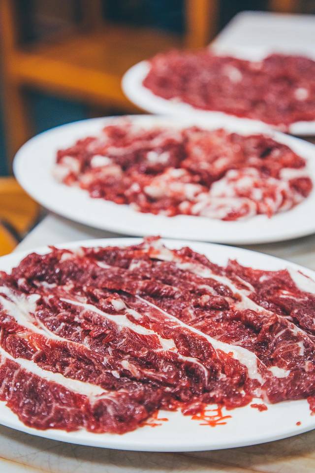 潮汕牛肉火锅的精髓就是在于牛肉本身,餐厅会取自牛肉身上的不同部位,从切下来到装好盘也只有几个小时不到,肉品色泽红润,透过暖光灯照射,食欲爆棚呢。