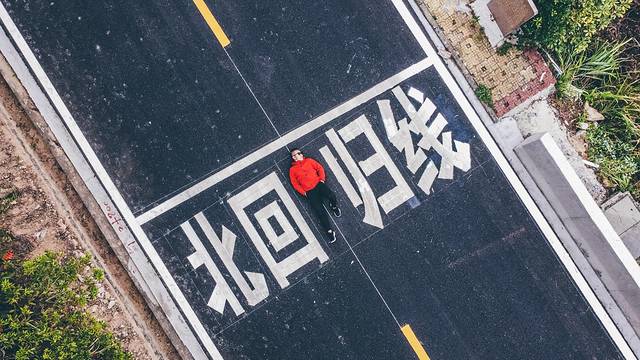 穿着鲜红的外套 躺在黑黄相间的公路上