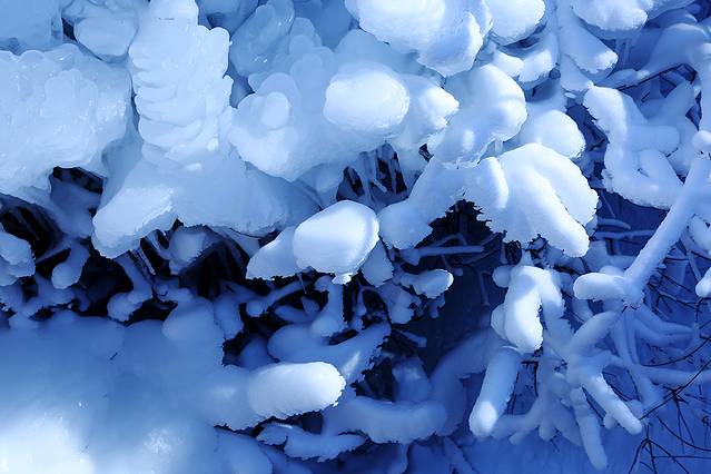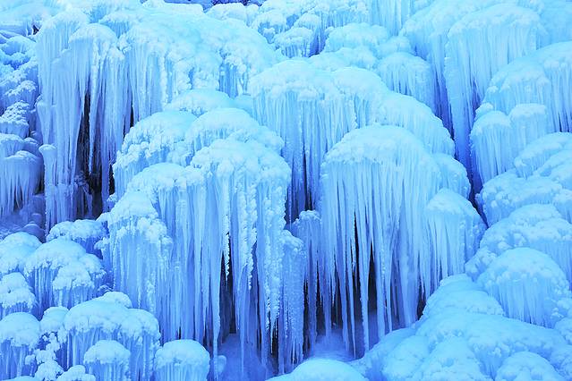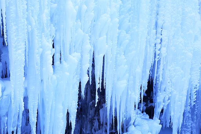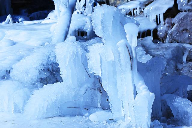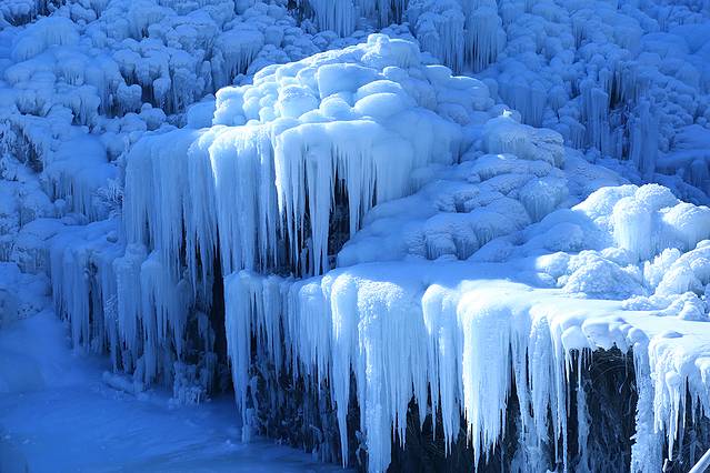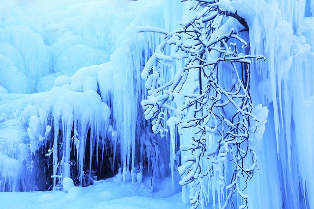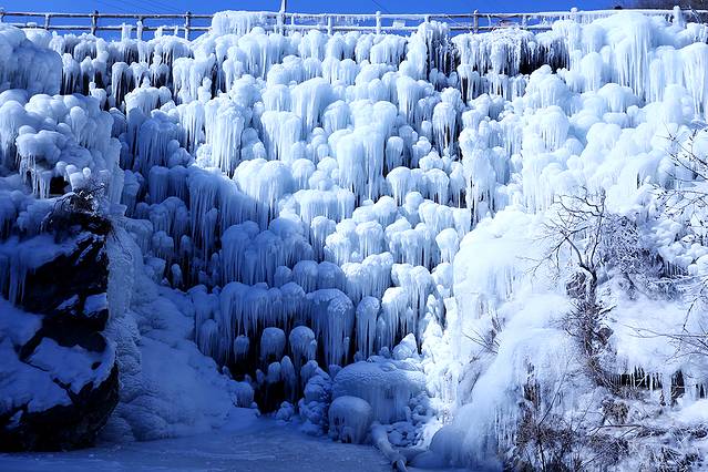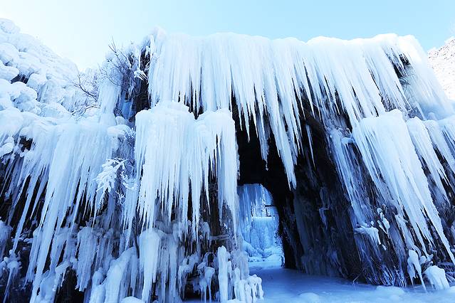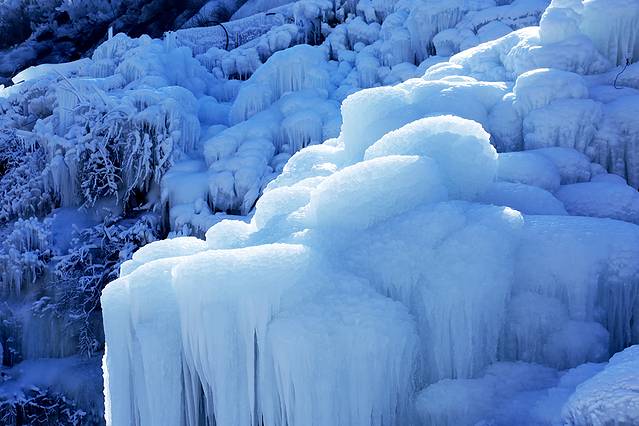 这么美的景色是因为神泉峡进入冬季后,从山上流下的溪水结成了冰瀑、冰川、冰柱、冰笋、冰凌....而这些冰花在湛蓝的天空下煞是惹眼,阳光经过折射,焕发出五彩光束,显现着独特的魅力。