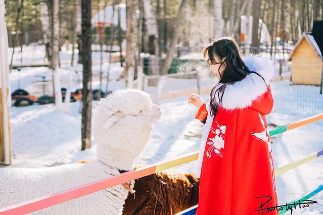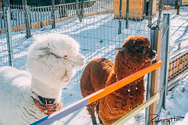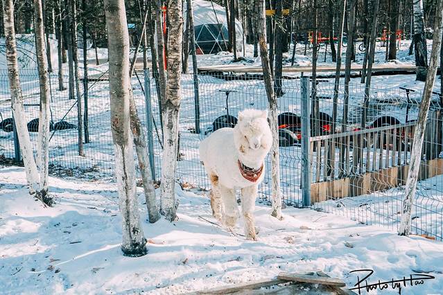小缅和羊驼们玩得非常的开心。这里的有两只羊驼,一只纯白,一只深棕。平时没事的时候就在园子里打转,有时候酒店里面的工作人员还会把他们牵出来在林间溜圈。