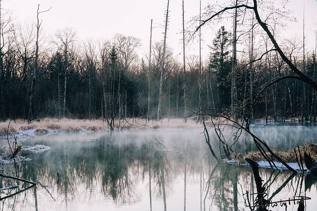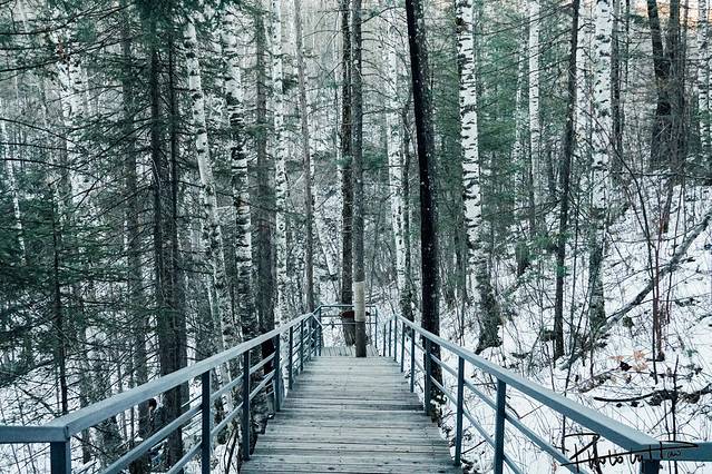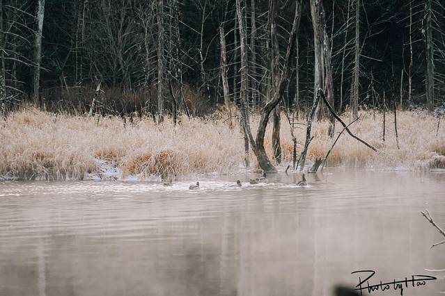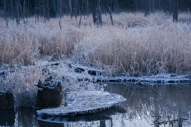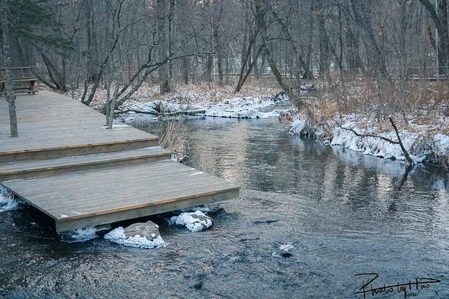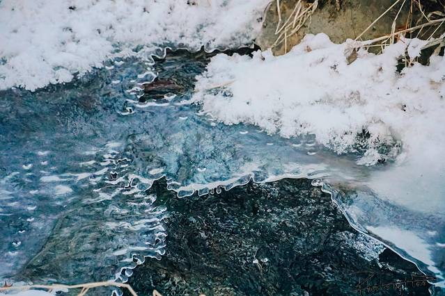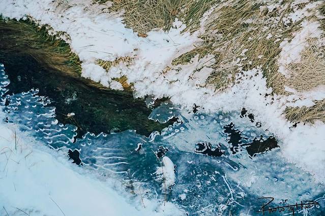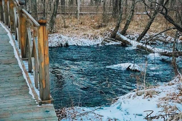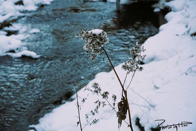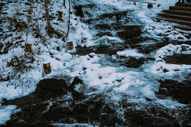 两旁都是林立的树木和被冰雪覆盖的草木,泉水在冰壳下咕咚咕咚的流动,就像在唱一首冬日的歌谣。