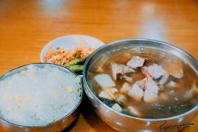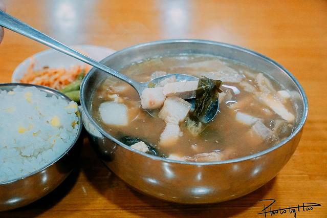 点了最经典和传统的大酱汤饭,没有想象中的浓郁,感觉有点日本味增汤的感觉,黄豆酱味比较明显。一大碗汤里装了满满的猪肉和蔬菜,把玉米饭泡进去后作为汤饭,不管是早餐还是夜宵,都是温暖全身的存在。
