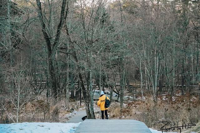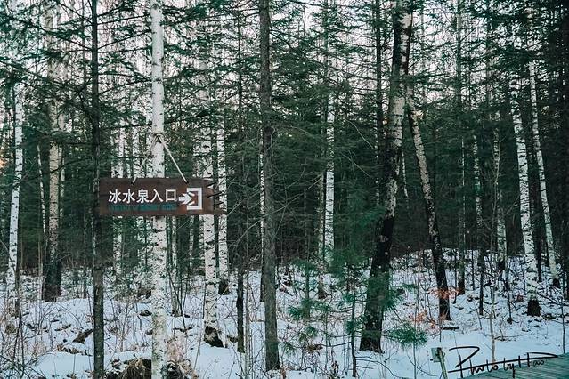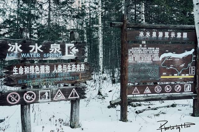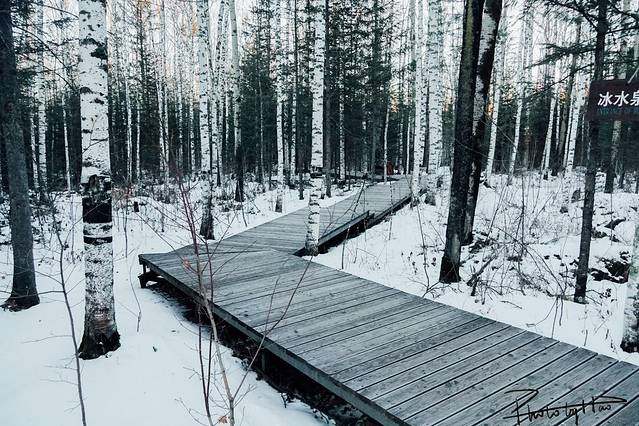 进入冰水泉景区后,里面俨然一片林海雪原的样子。行走在栈桥上,作为一个南方人很想跳下栈桥去感受这厚实的雪,但因为不知道这雪到底堆了多高,所以心里还是有点发怵。