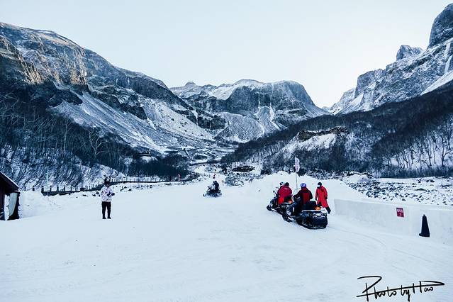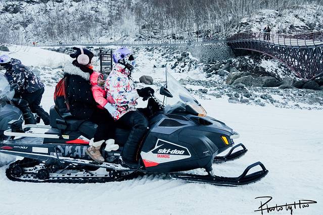 天池瀑布在半山腰上,要想前往可以全程徒步,也可以选择体验雪地摩托疾驰的乐趣。在茫茫的冰雪世界中,疾驰着雪地摩托纵横,感受速度与激情。