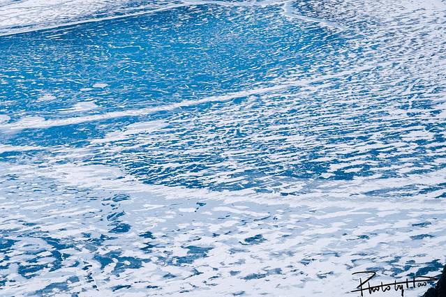 冬季的天池湖水,早已冻结成冰,虽然正午阳光直射湖面反射光线,但依然掩盖不了那一整块的透蓝。湖面上的雪迹被风吹散成涟漪状,覆盖住冰面。