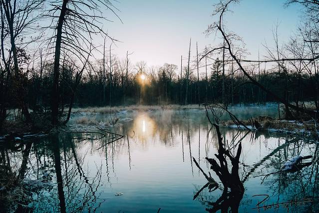 天空逐渐出现金光,湖面上也逐渐升腾起了雾气,恍如仙境。