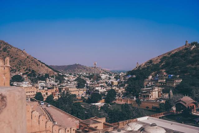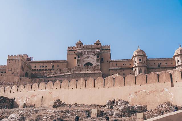 琥珀堡位于斋浦尔的旧都Amber一座能俯视全城的山丘之上,是印度古代藩王Raja Man Singh于1592年建立的都城。不同于“粉红之城”的其他建筑颜色,城堡由奶白、浅黄、玫瑰红及纯白石料建成,远看犹如琥珀,故称之为琥珀堡。堡垒内规模宏大华丽,有接见公众的Hall of Public Audience、接见大臣的Hall of Private Audience、皇室居住的庭院。特别是“镜之宫”Sheesh Mahal尤其瑰丽,宫殿用玻璃嵌壁,在阳光的反射下,整个宫殿熠熠生辉。