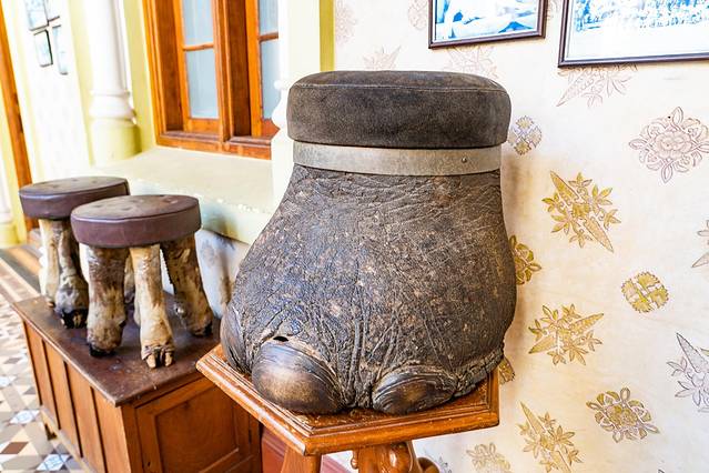 其中一处还摆放着大象腿和大象鼻子的标本,还有一些其他动物的腿做的椅子。