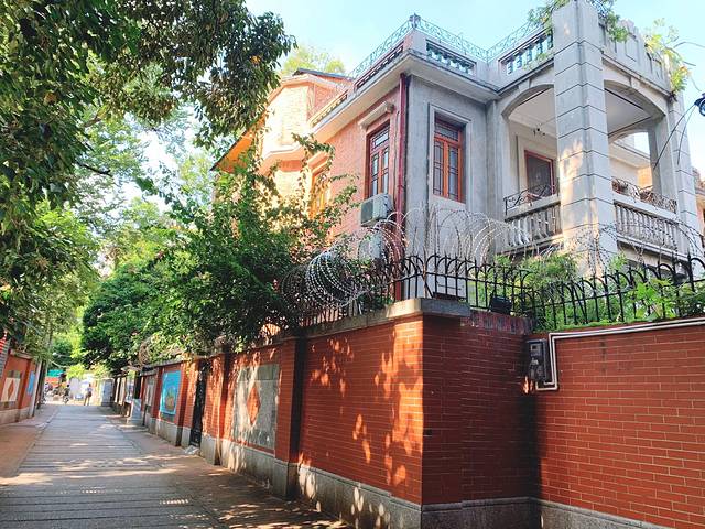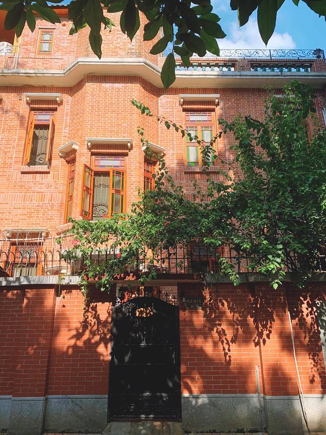 下午的阳光投射到洋房上,红砖蓝天绿叶衬托下,别有一番韵味,美!