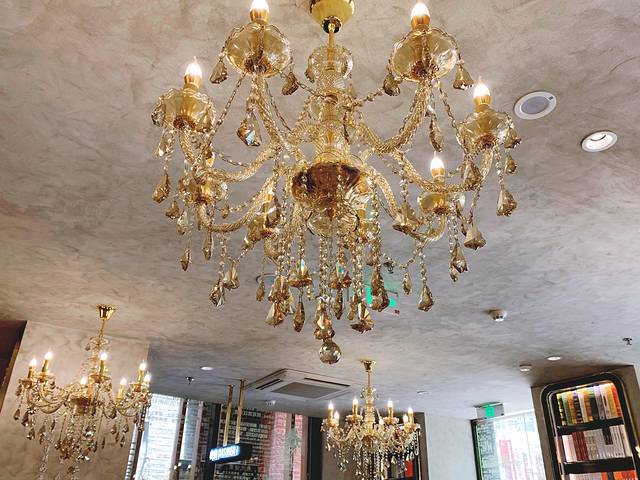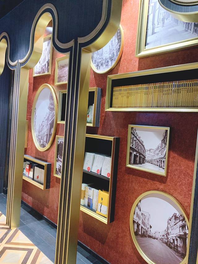 店内以黑金为主调,神秘而复古,加入最熟悉的镬耳屋、菱形拼花地板还有水晶吊灯、满洲窗,仿佛置身于岭南文化中。