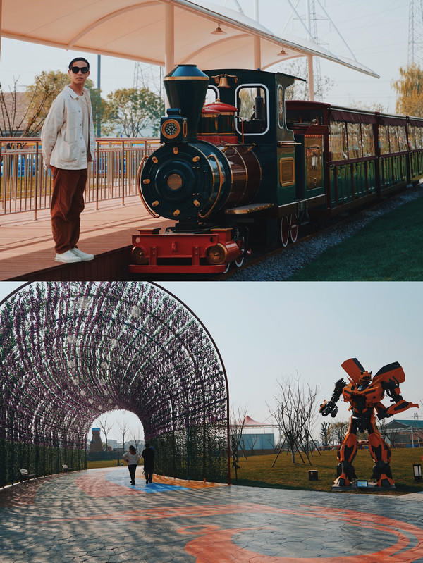 走过造型独特的观光长廊,阳光与影子捉迷藏,构成的美好图案可以让我玩一个下午。从这里再往前就能找到凤煌乐园特别准备的绿色小火车。