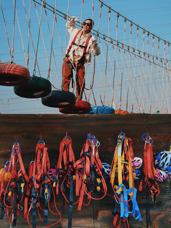 寒冷的冬天当然需要一点激情来暖和一下,就从最简单的钢铁丛林开始吧,在绿草坪上设计了14根钢铁巨柱,把通过钢缆链接起来,组成不同难度的探险关卡,简单易上手,很适合作为热身项目,保护措施也非常到位。通关的话只要稍微找一下节奏技巧就好了,对于女孩子来说也很好玩,而且用到的彩色道具缓解了冬天的萧瑟感,拍照元气满满,玩的很开心。