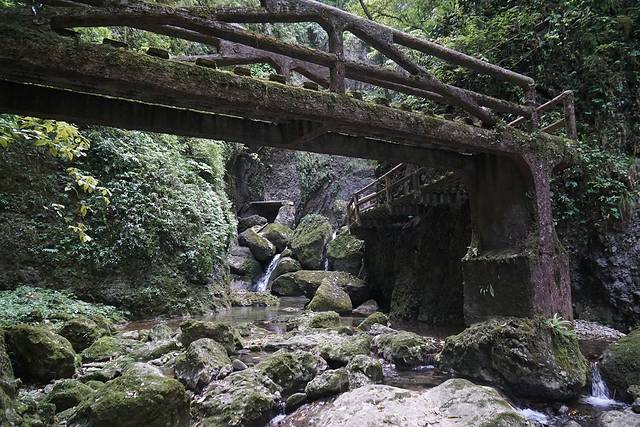 绕到五龙沟,欣赏龙隐峡栈道,其石梯、石栈、悬桥上下勾连,依山曲折,悬架于飞瀑寒潭间,令人望而生寒。
