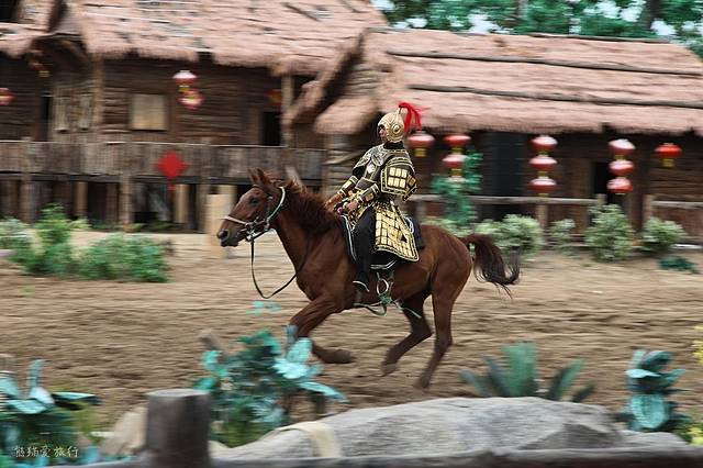 园区里大大小小的表演里,有一场特别气势宏大的实景演出,千万别错过,这就是《战神赵子龙》,话说实景演出看了那么多,这个演出是第一个实景马战演艺,在现场可以近距离感受到惊险刺激的马术表演,同时结合上赵子龙勇救甘夫人和阿斗的情节,让我们沉浸其中,好像随着表演穿越回了汉末群雄割据的英雄时代,真是太震撼的视听体验!