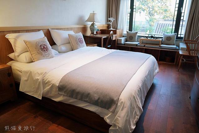 酒店里还有一方小小的苏式园林,凸显出江南古典园林的秀美。房间里,简约的明式家具、浓墨淡雅的中国山水画,仅仅少数的几个细节就完美营造出中国传统文化韵味和与众不同的舒适感。水隠房可以枕着潺潺的涧声入眠,山隐房则可以眺望满山的苍翠。在楼顶还有户外茶座,在这儿可以远眺竹林和茶园。