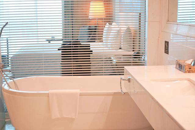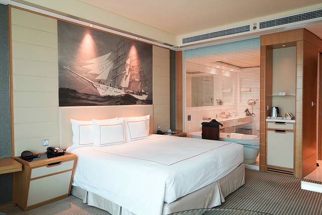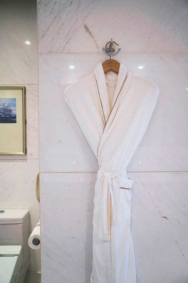 房间内设计为航海风格,格调十足,布局温馨,设施一应俱全:浴缸、双洗手台、全自动马桶、戴森吹风机…细节服务极为贴心。