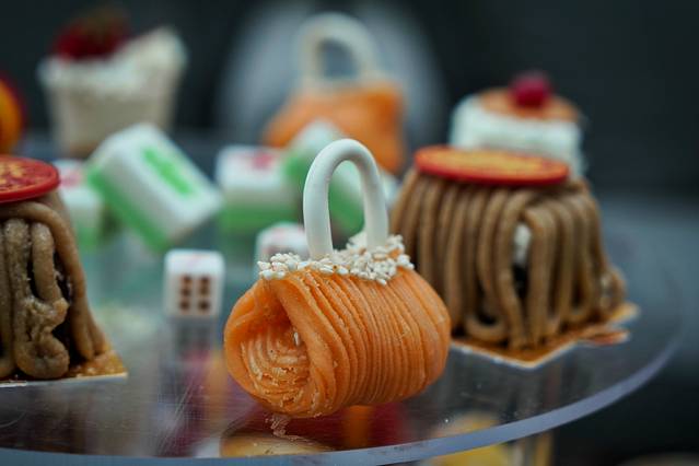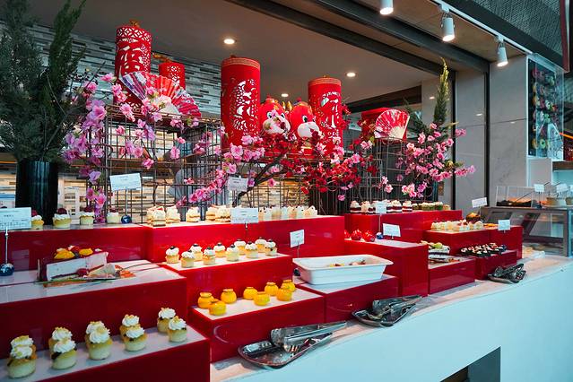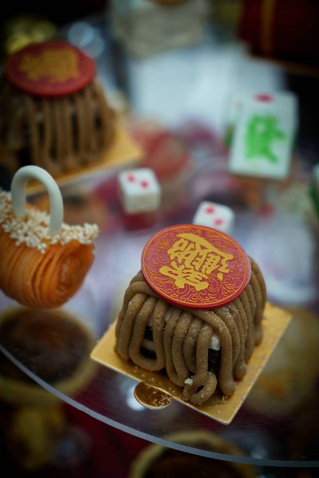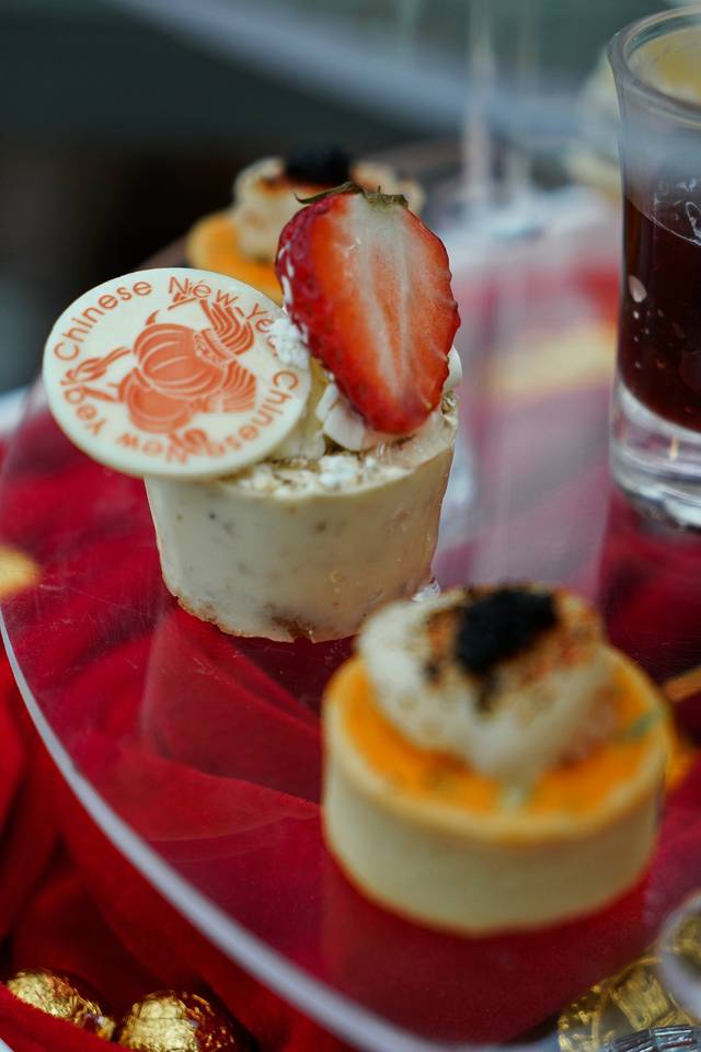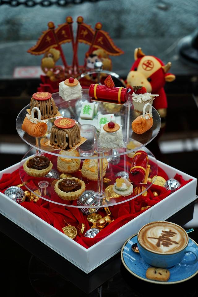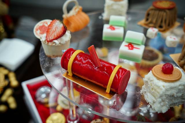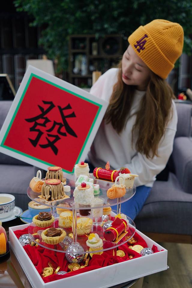 下午茶套餐内含多种口味:新春爆竹(草莓芝士蛋糕)、惊喜福袋(芒果荔枝巧克力蛋糕)、蜜汁鲍鱼酥、榴莲蛋糕、麻将凉糕、燕窝灌汤饺等等,味美颜值高,很契合新春氛围。
