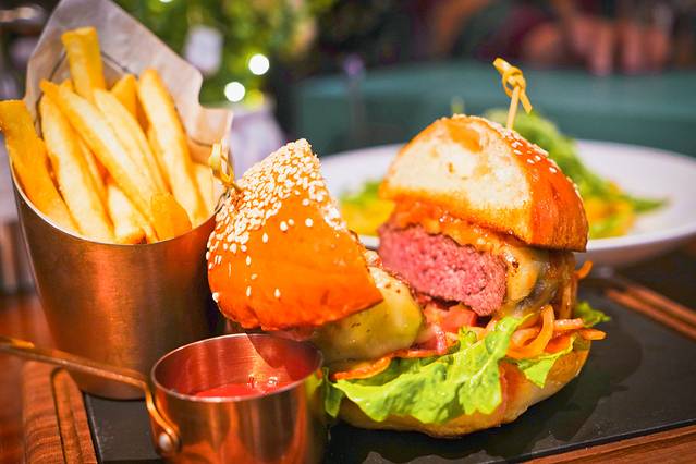 德克萨斯州和牛汗堡:店里必点特色汉堡,要的全熟,牛肉很厚实,搭配了炸薯条。