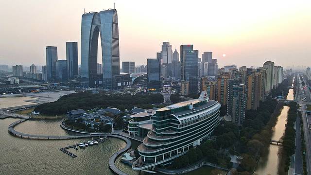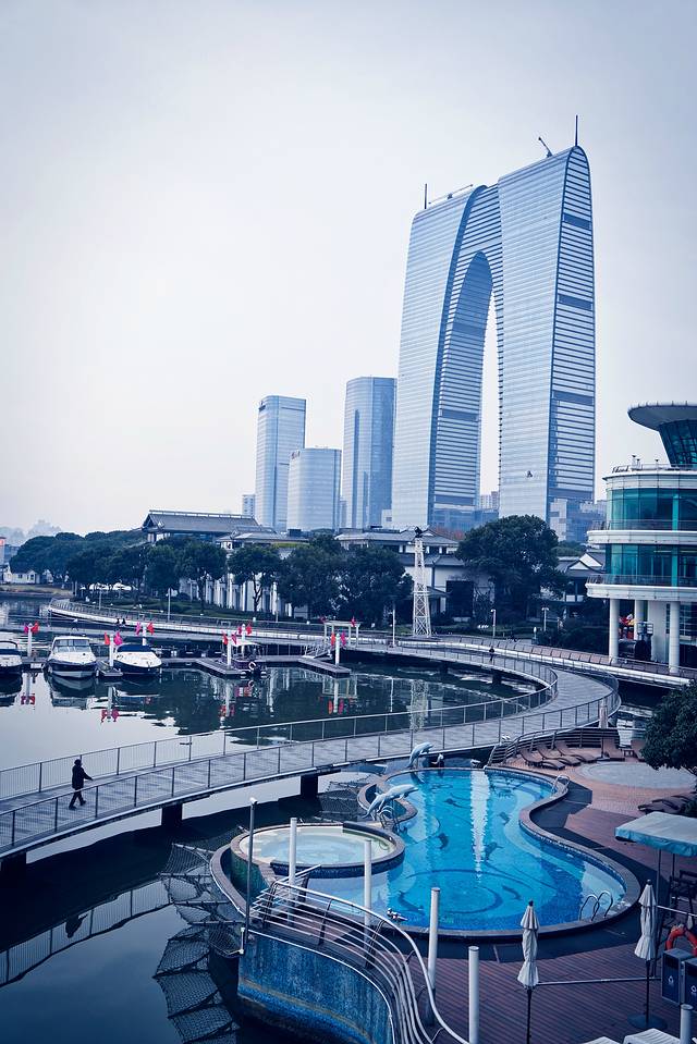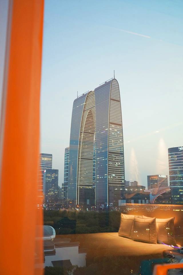 和好友预定的至尊湖景大床房,从落地窗望出去,就能看到苏州的标志性建筑“东方之门”,美丽的金鸡湖景致尽收眼底,视野非常棒。