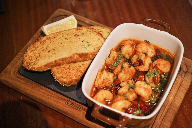 西班牙蒜香虾:一端上来就香气扑鼻,虾仁紧致,炒的很入味,搭配烤至金黄的香脆面包片,好吃到停不下来。