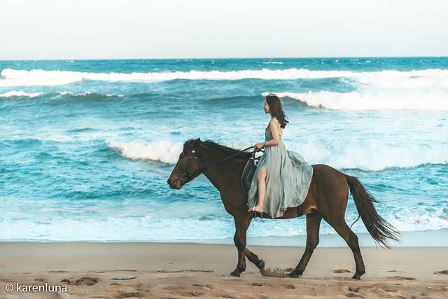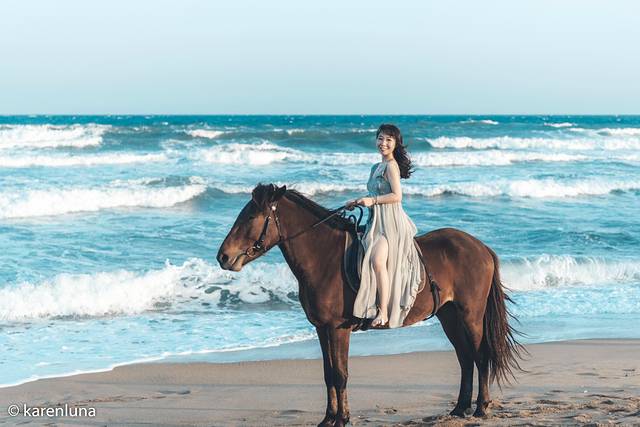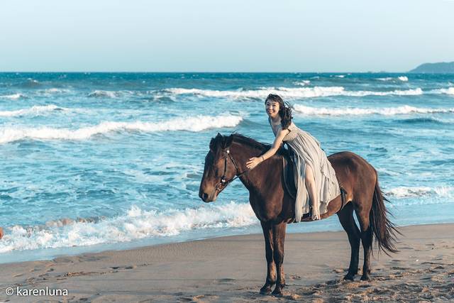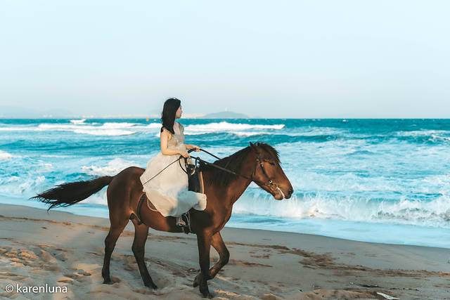 刚骑上马的时候真是害怕的要死,马一动我就本能的紧抓着缰绳完全不敢动,只能让马在原地站着摆一些poss。但经过马主人耐心的安慰和手把手教我控马技巧后,终于可以放轻松,在没人牵马的情况下独自走上几个来回啦!金色的夕阳洒在马背上、洒在自己的身上,故作镇定的行走在澎湃的海浪间,真是有种乘风破浪的霸气感。