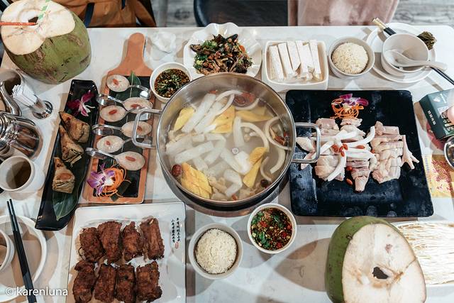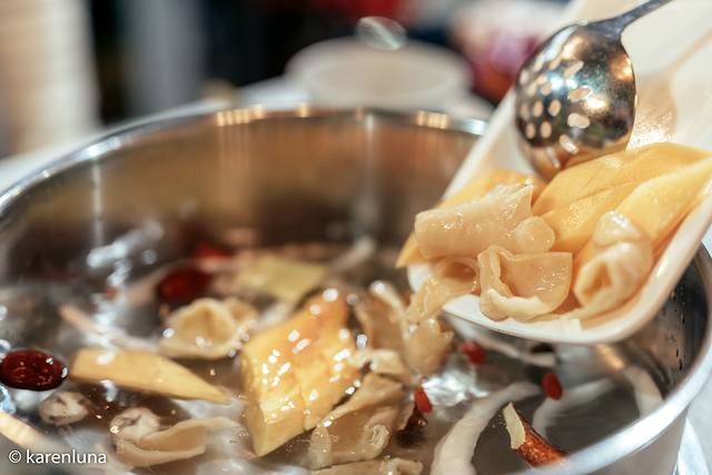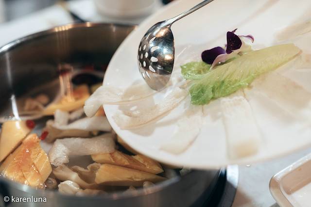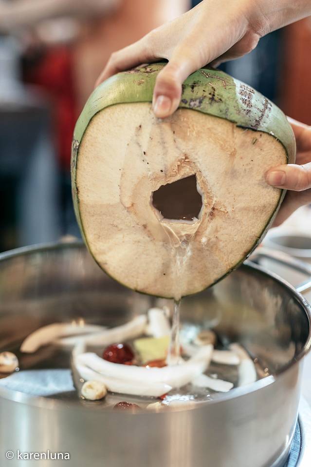 三个大椰子汁倒入锅中作为汤底,再加入海椰皇和五指山毛桃、珍珠马蹄等多种珍贵食材,除此之外我们点的花胶木瓜椰子鸡还在汤底中加入了芒果、花胶等,让锅底除了原本的椰香浓郁外还多了些美容养颜的营养,真是太适合女生了。