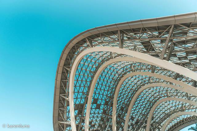 建筑外墙的蜂窝网状落地玻璃墙和一个个直通屋顶的网状天窗让人有种置身蜂巢中的神秘感,而阳光通过这些天窗撒向航站楼内,就像是一条光影瀑布倾泻而下,真是太好看了!