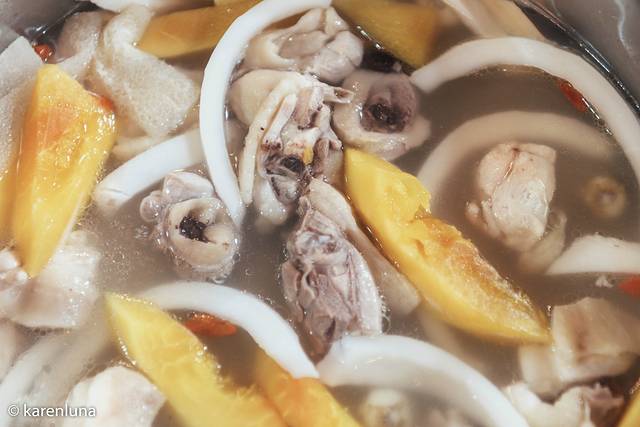 别光顾着吃肉,讲究的鸡汤也是相当美味呢!浓郁的咸鲜鸡汤中,多了些椰子的清甜,和芒果的香甜,口味独特,但却是我喜欢的味道,结果没收住一连喝了好几碗,以至于妈妈都要制止我了,怕我把锅里的汤都喝光~